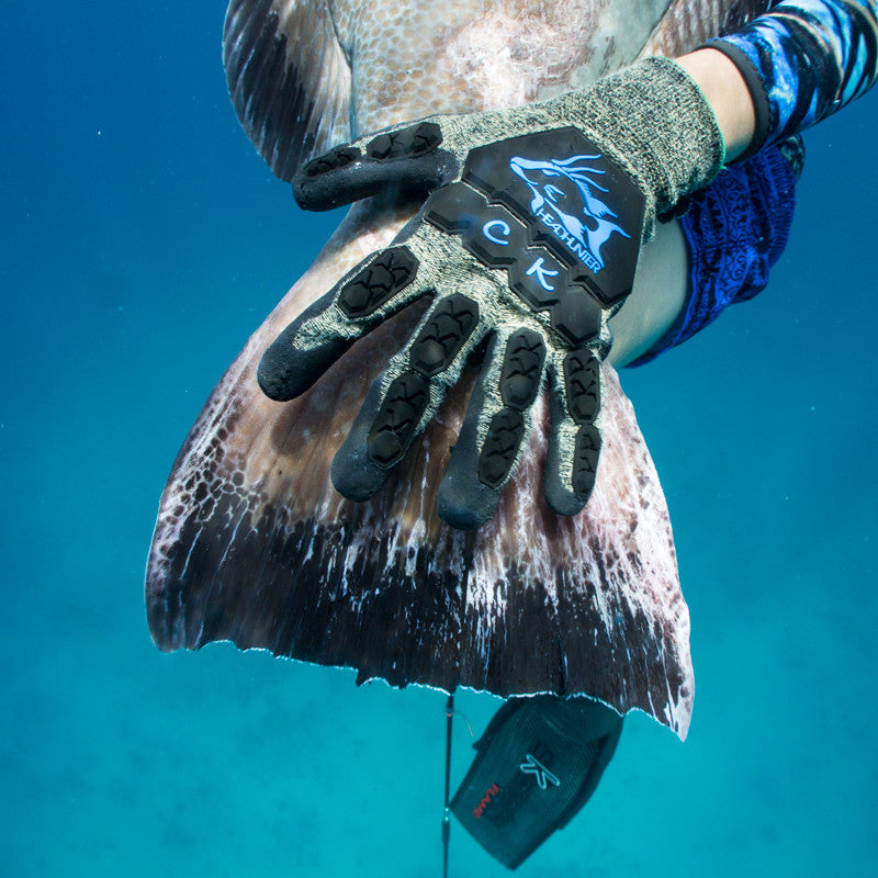 The BAMF Lobster gloves were developed thanks to a collaboration between Headhunter Spearfishing and Cameron Kirkconnell. The gloves are made from a woven Kevlar with industrial cut resistance. The grip was designed to work well with pole spears, Hawaiian slings, and spear guns alike. All of the lobster gloves (excluding the XS) have a flexible rubber over-molding on the topside of the glove to protect against, sharp rocks, lobster, and fish gills. This glove offers a combination of great dexterity and protection and comes in a variety of sizes ranging from XS to XXL.